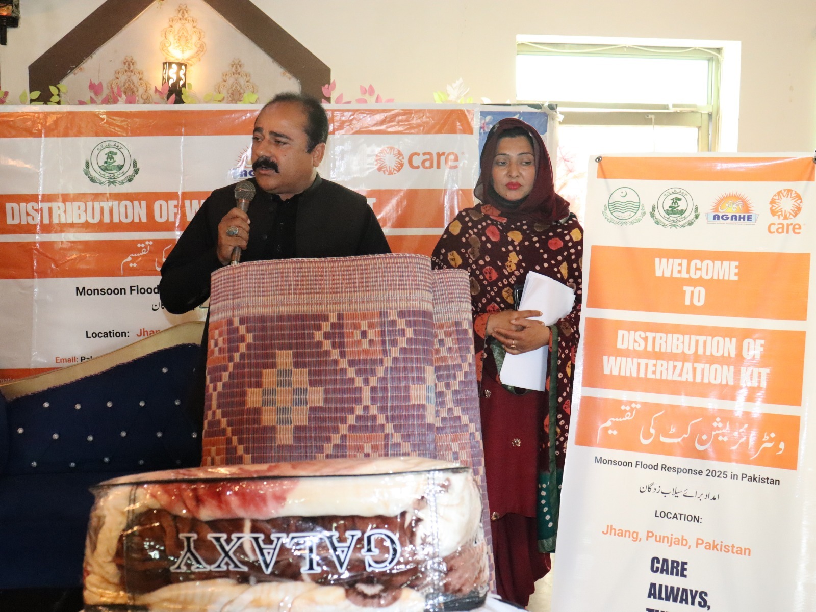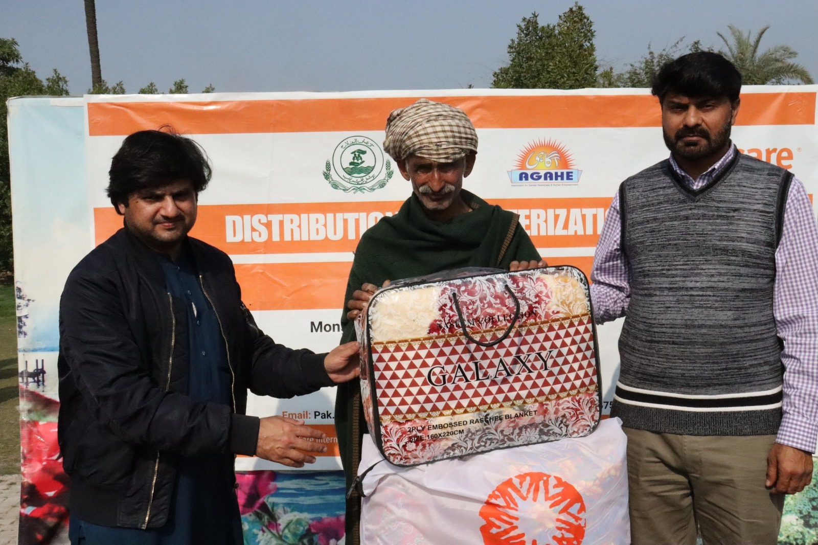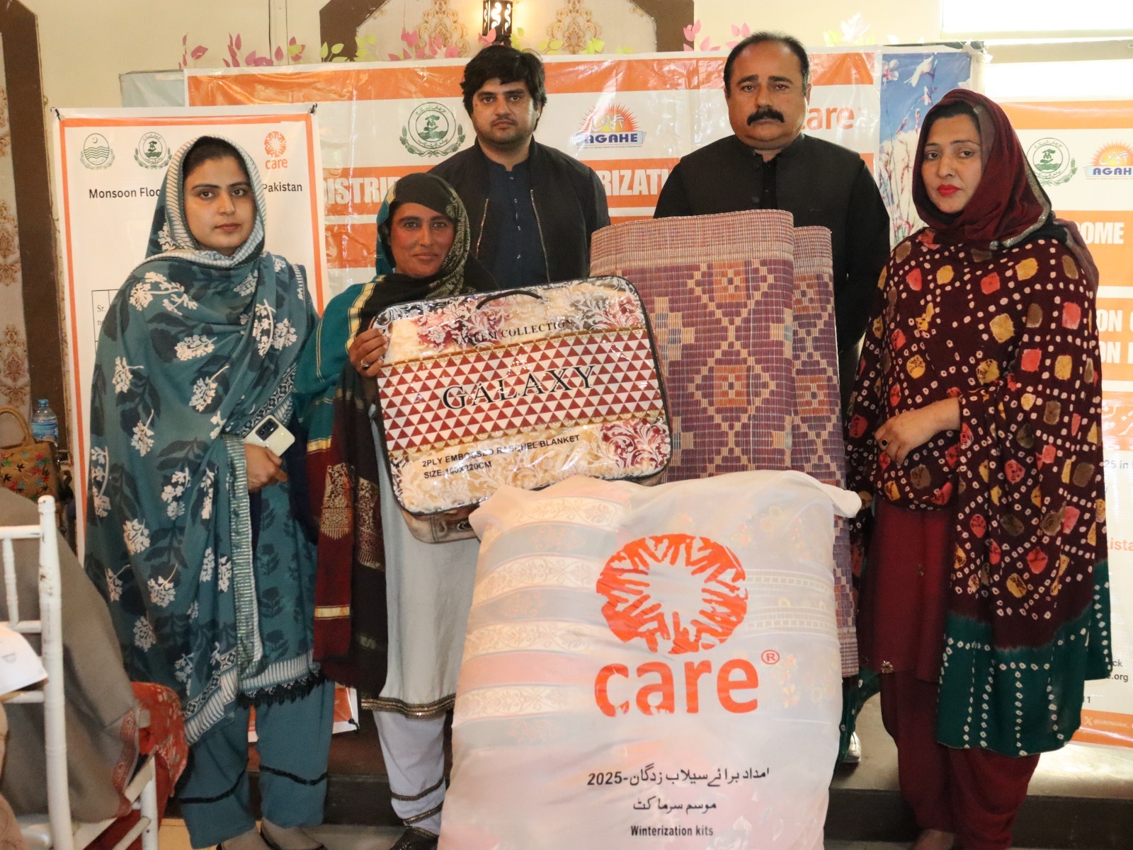 On February 06, AGAHE, with the support of CARE International, distributed winterization kits to 300 flood affected families in UC Ratta Matta at Al Hadeeqa Marriage Hall, Tehsil and District Jhang. The kits included essential winter items to help vulnerable households cope with cold weather conditions. Representatives from the Social Welfare Department and Bait ul Mal attended the activity and appreciated the efforts of the project team.