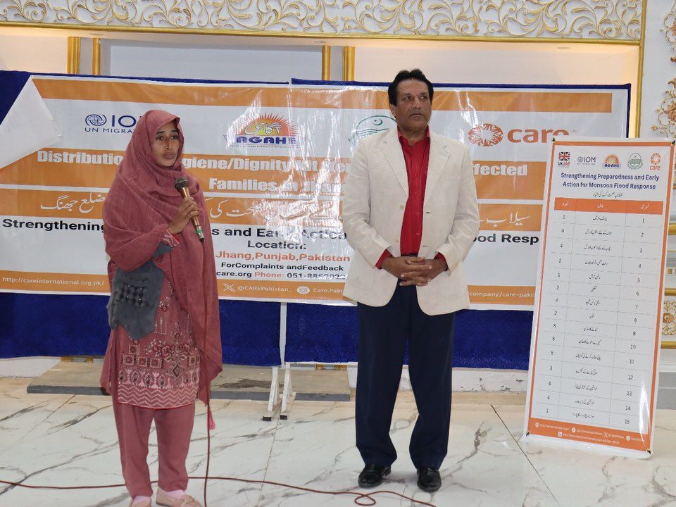 AGAHE successfully organized a distribution event for 300 Hygiene/Dignity Kits for vulnerable women of Sultan Pur Union Council, Jhang, under the project “Strengthening Preparedness and Early Action for Monsoon Flood Response,” supported by CARE International.