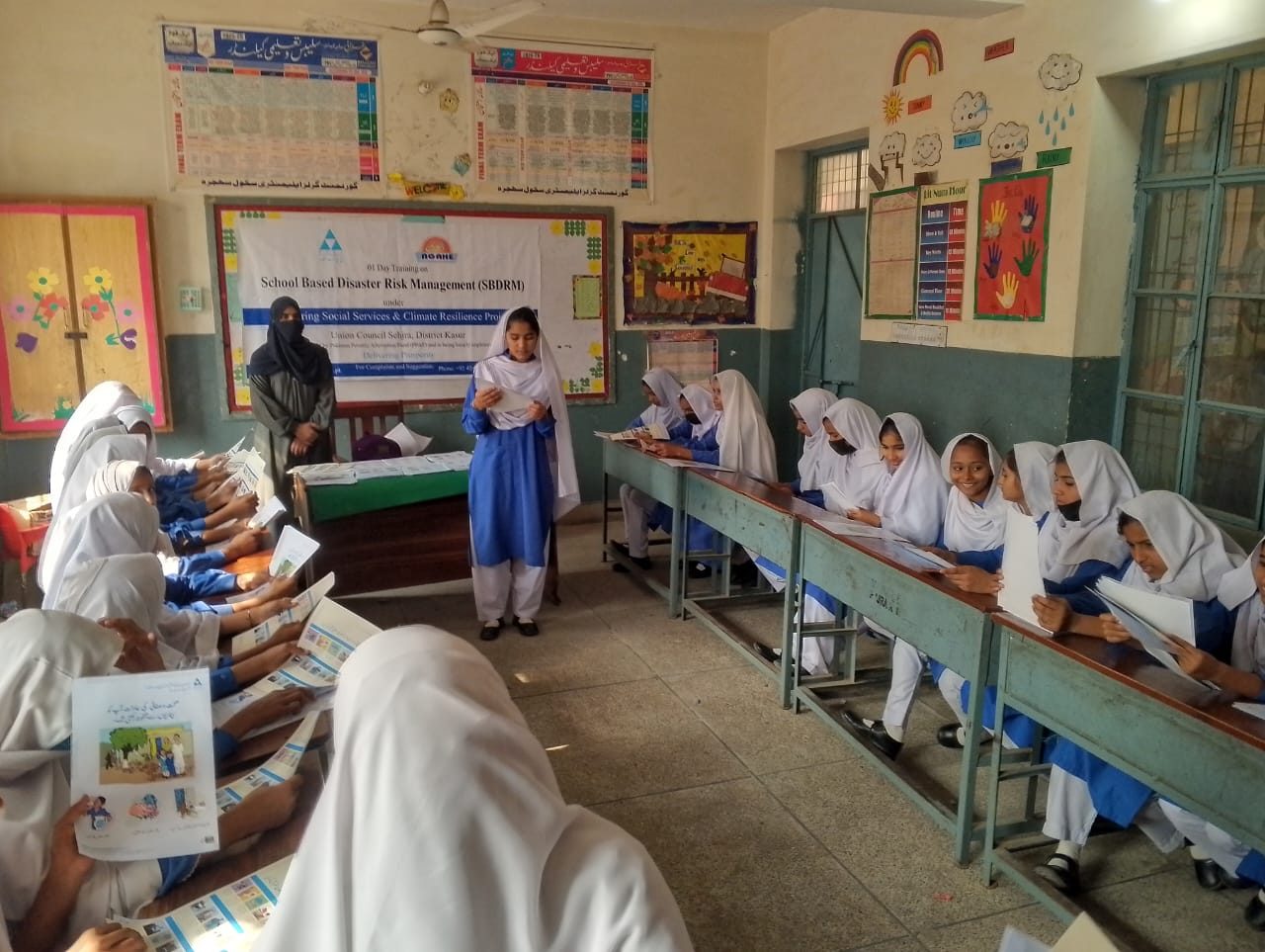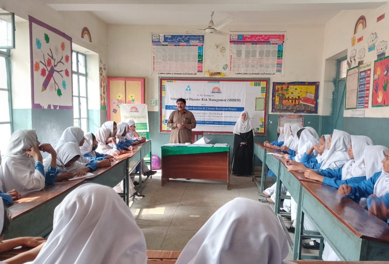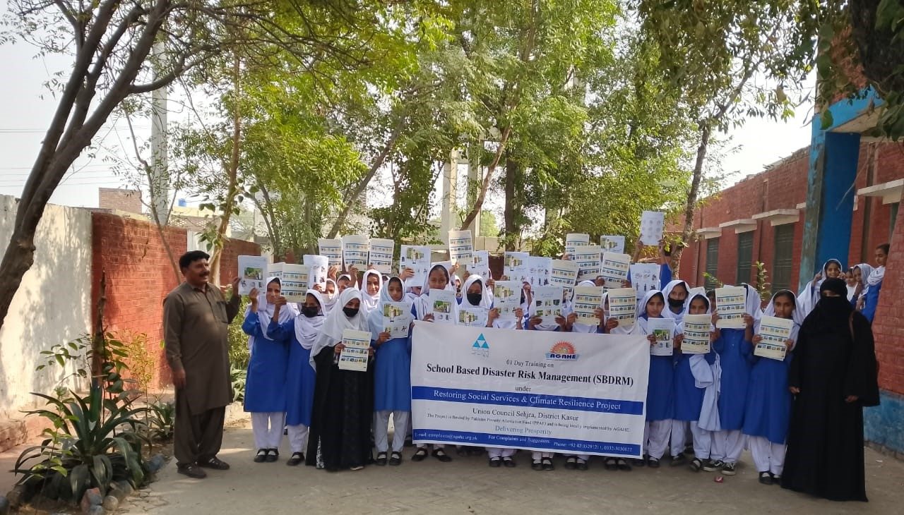 AGAHE, with financial support from Pakistan Poverty Alleviation Fund under the RSS & CR Project, conducted a one-day School-Based Disaster Risk Management (SBDRM) session at GGES Sehjra, UC Sehjra, District Kasur. A total of 49 schoolgirls, SMC members, and teachers participated in the training, which strengthened their knowledge and skills on disaster preparedness and response.