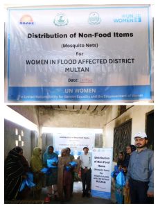 With the support of UN Women and in collaboration with the Deputy Administration of Muzaffargarh & Multan, Social Welfare Department, Bait-ul-Maal, and the Health Department, AGAHE distributed mosquito nets to 100 flood-affected families and provided cooked food in District Multan & Muzaffar Garh.