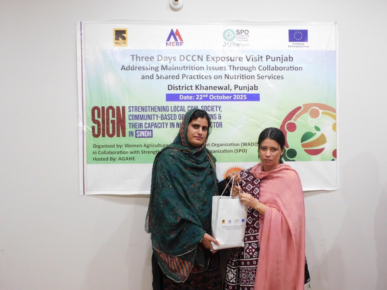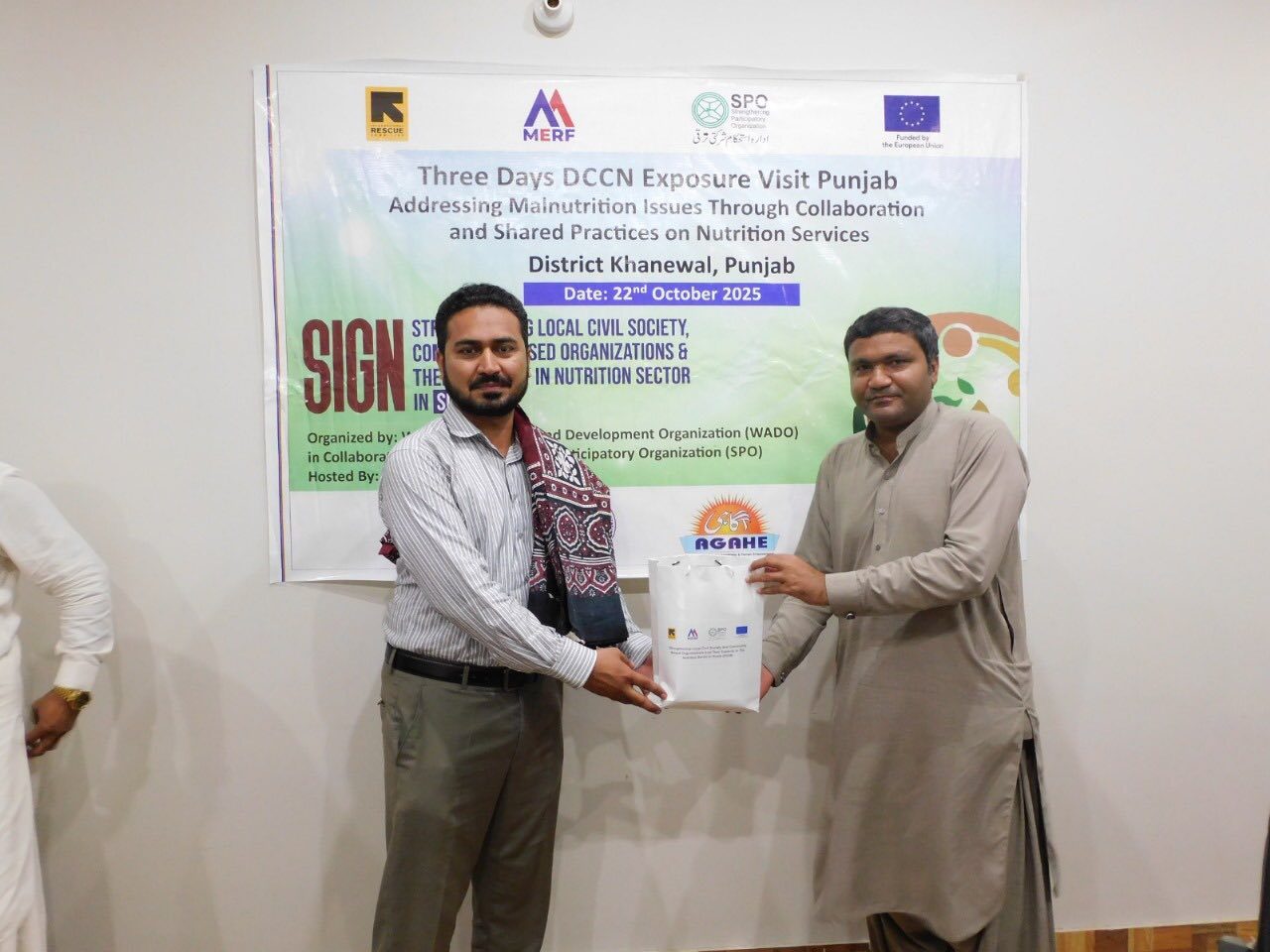 During the visit, participants were briefed on AGAHE’s interventions under the Scaling up Biofortified Zinc Wheat (SU BZW) project. The delegation visited women entrepreneur Gulzar Mai, Awais Atta Chaki (flour processing unit), and the CBO in 26/10R. They appreciated AGAHE’s strong community engagement and sustainable field-level interventions. WADO also presented visibility kits — including a mug, bottle, diary, and Ajrak — to the AGAHE team as a token of appreciation and goodwill.